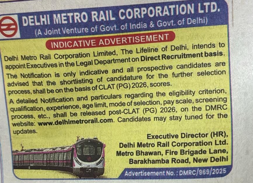 DMRC has released a short notice in the newspaper for the recruitment based on CLAT Score 2026. And this recruitment is for the post of executive. The number of vacancies has not been announced yet. Friends, if you are dreaming of getting a job in DMRC, then you will have to appear for the CLAT 2026 exam. The registration process for CLAT 2026 is currently underway. Eligible candidates should apply soon.