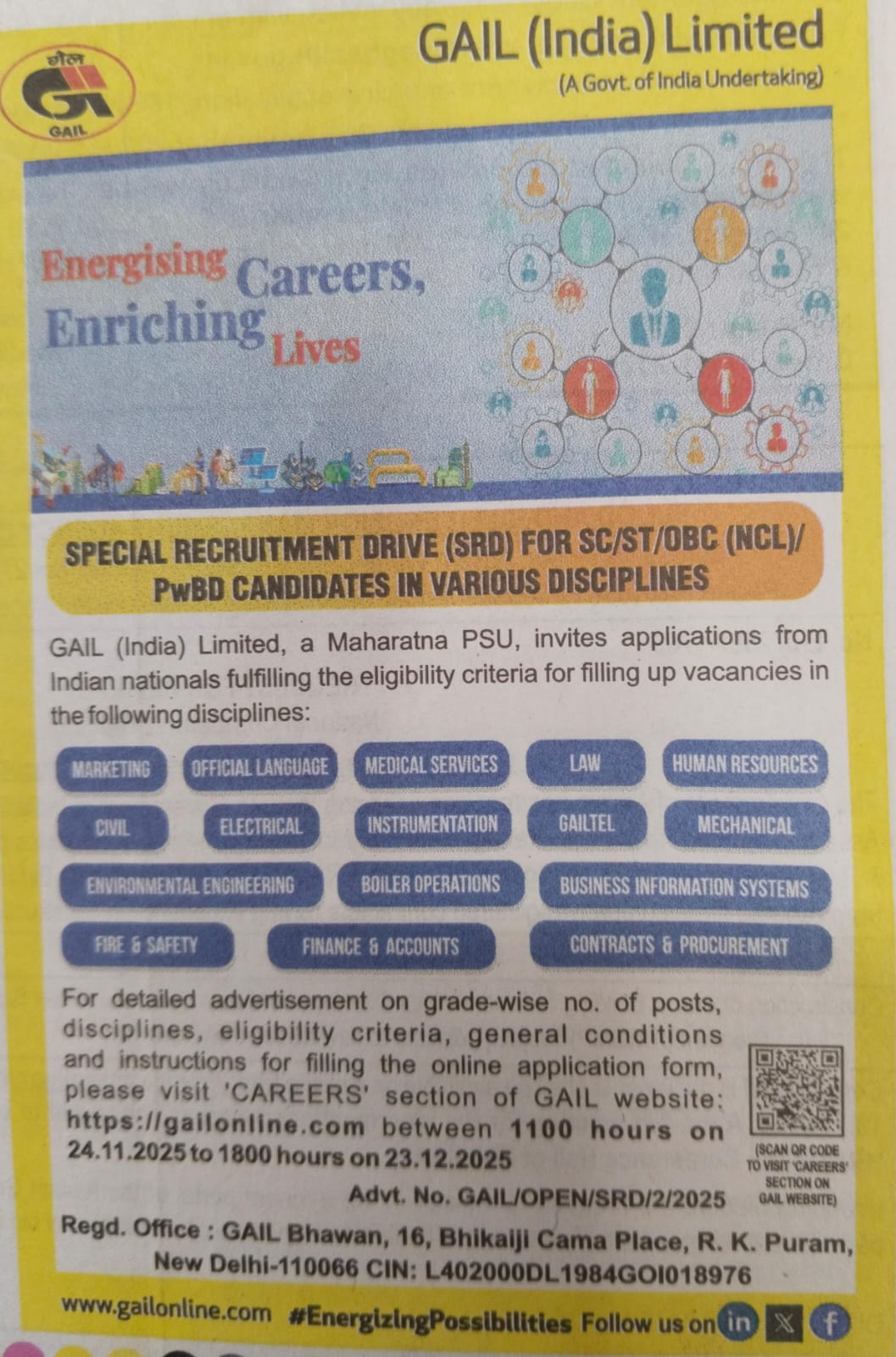 GAIL (India) Limited has announced a Special Recruitment Drive (SRD) exclusively for candidates belonging to SC, ST, OBC (Non-Creamy Layer), and Persons with Benchmark Disabilities (PwBD) categories