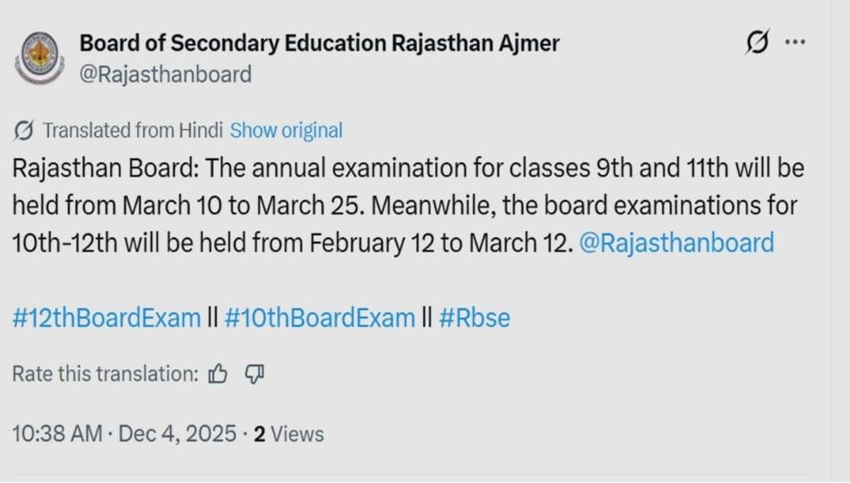 ट्वीट के मुताबिक, RBSE क्लास 9th और 10th एग्जाम 10 मार्च से 25 मार्च, 2026 तक होंगे। और दूसरी क्लास यानी क्लास 10th से 12th एग्जाम 12 फरवरी से 12 मार्च, 2026 तक होंगे।